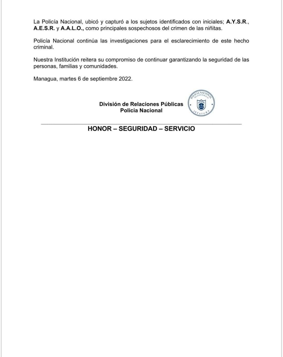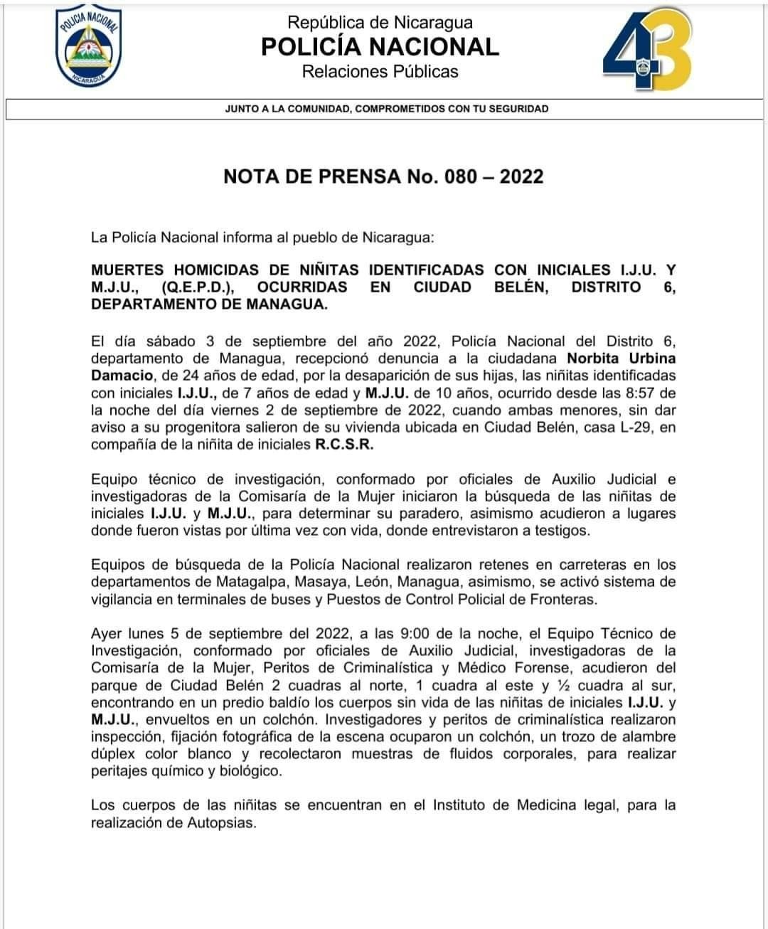 “Los cuerpos sin vida encontrados del parque de Ciudad Belén dos cuadras al norte, una cuadra al oeste y media al sur, son los de las niñas de iniciales M.J.U., de 10 años y L.J.U., de 7 años”, se lee el comunicado de la Policía.